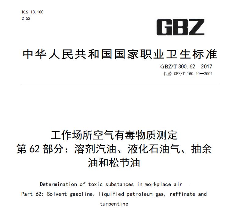 GBZ/T 300.62-2017 工作場所空氣有毒物質(zhì)測定 第62部分:溶劑汽油、液化石油氣、抽余油和松節(jié)油 GBZ/T300.62-2017工作場所空氣有毒物質(zhì)測定第62部分:溶劑汽油、液化石油氣、抽余油和... 更新日期:2020-05-11 下載包(1)