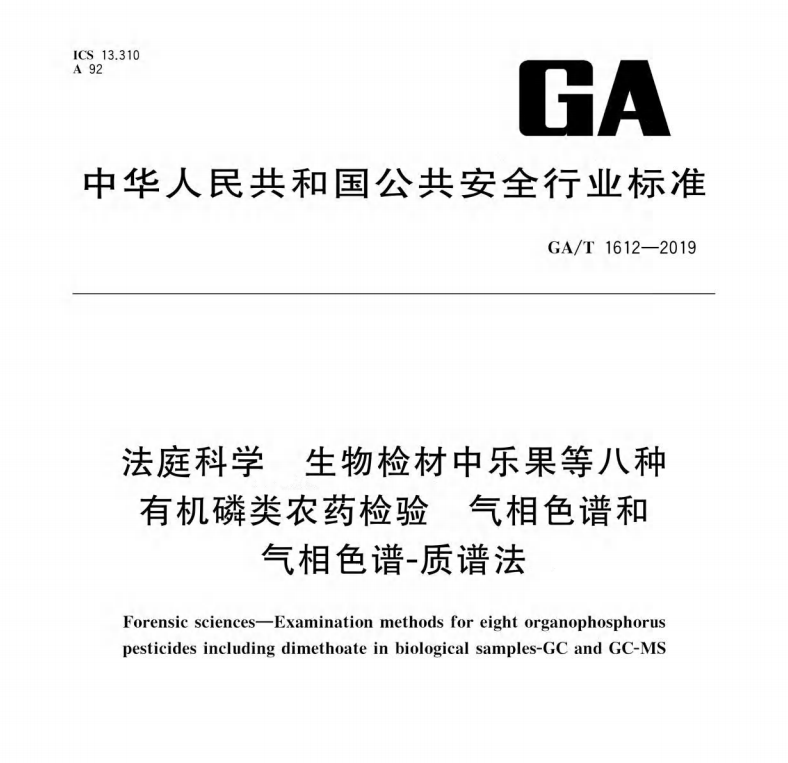 GAT16122019法庭科學(xué)生物檢材中樂(lè)果等八種有機(jī)磷類(lèi)農(nóng)藥檢驗(yàn)氣相色譜和氣相色譜質(zhì)譜法 更新日期:2022-12-30 下載包(1)